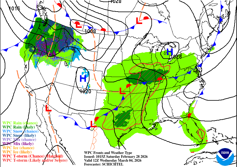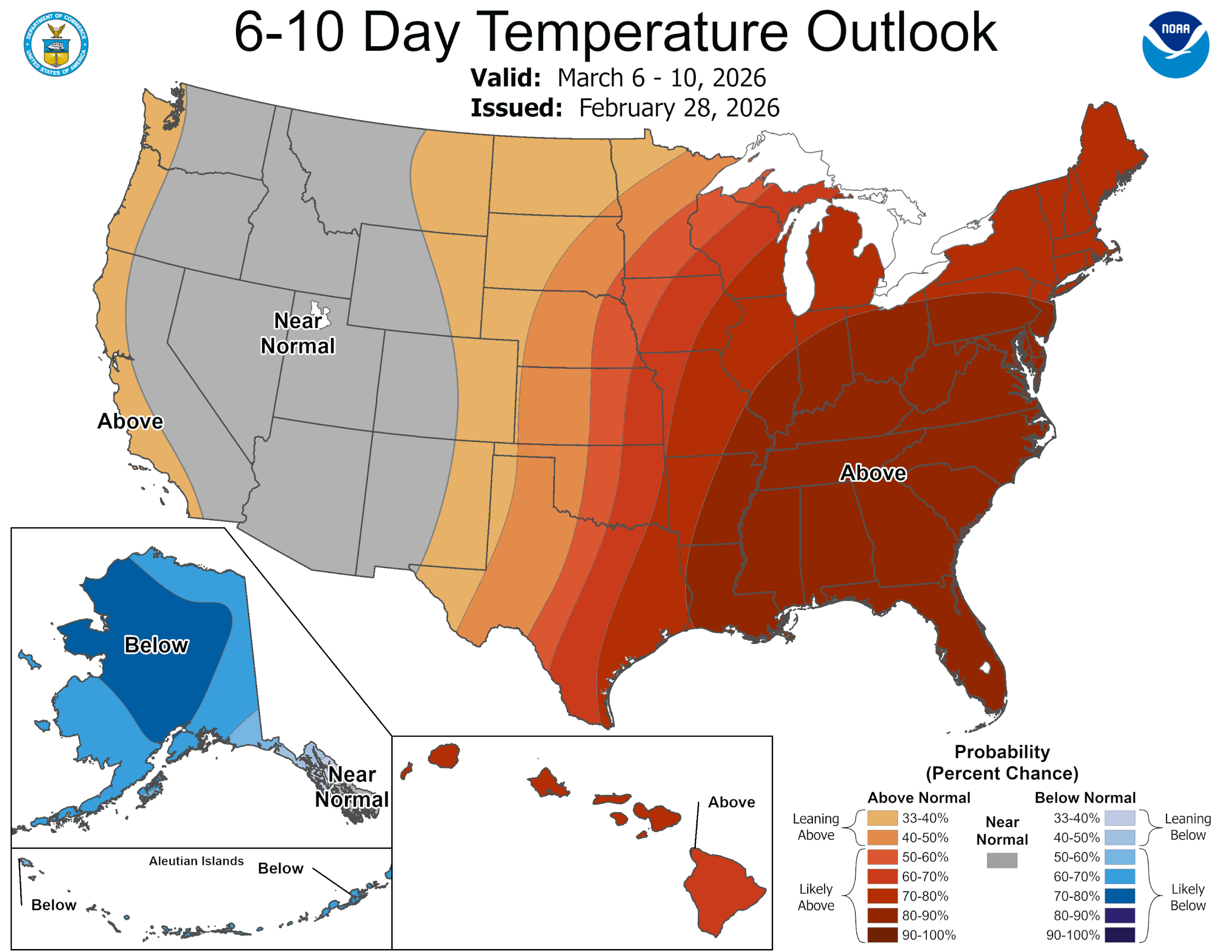 Yet another warm end of February day out there with highs in the mid to upper 80’s for most locations. As I have been saying, more of the same through early next week as high pressure remains in control. By the middle part of the week and especially as we head into the weekend, a large trough over the west will start impacting our weather for potentially the next two weeks as high pressure finally breaks down and rain chances rise. We will start seeing rain in the forecast by Wednesday as a dying front in west Texas, along with SW flow off the Pacific, gives us our first chances for rain. The latest CPC outlooks keep us in better than even odds for above normal rainfall through the 14th of March.