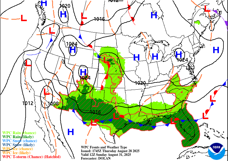 A couple more steamy days until we get some relief over the weekend in the form of scattered storms and some “not so hot” air. The much advertised cool front will start slipping into Texas tomorrow, then will go stationary on Saturday somewhere in central Texas. By Sunday, it will slowly move to the south, ending up in south Texas by Monday. Cooler air will be most noticeable in the Hill Country, where lows will drop into the 60’s by Sunday and Monday morning. Rain odds will be on the increase on Saturday and will hang around through at least Tuesday. As I have mentioned, this system could produce some pockets of heavy rain, but the activity will be scattered, so as usual, there will be rain lottery winners and losers. Best odds for rain will be in our northern counties and the Hill Country.