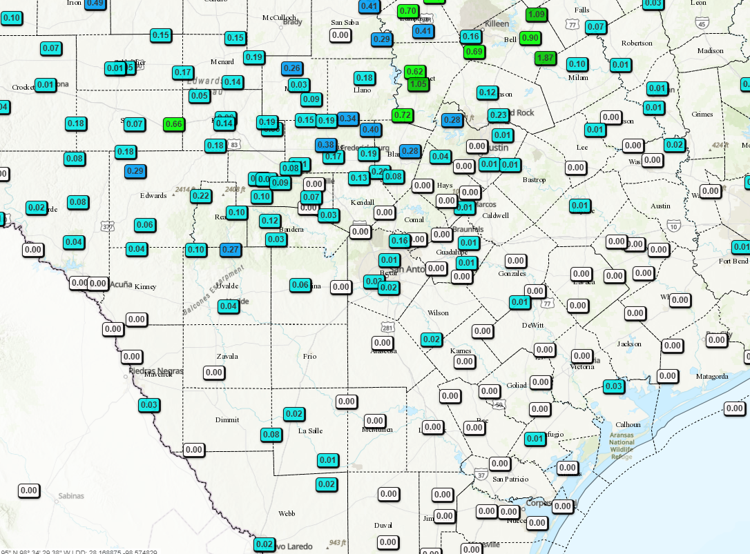 Our much advertised front is now just to the north of San Antonio as of post time. Scattered storms are forming along the front and will move SE along the front today. As the front moves into south Texas, it should slow down a bit, allowing for more rain to fall than what we have seen so far this morning in the Hill Country. Storms will continue to be scattered, so some of you may see some pockets of heavy rain, while other see less. The good news is that even as the front passes, there will be two approaching disturbances coming in from Mexico over the next 48 hrs. The first one arrives early on Sunday and the next one overnight early on Monday. These two systems will impact south Texas more than south-central Texas, but both locations should see some rain from these.