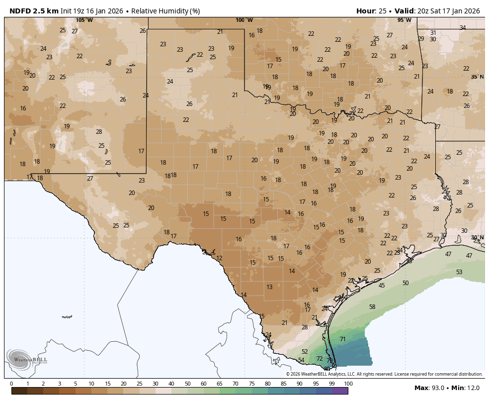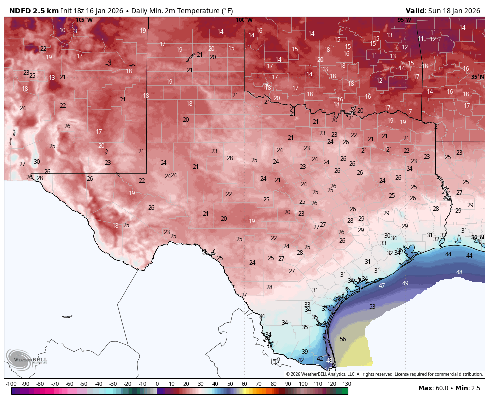 Another “2fer” front is on the way, with the first one about to move through San Antonio and the second one forecast to move through early on Saturday morning. While both will give us dry, gusty winds, its the one on Saturday that is concerning the NWS and why they issued a Red Flag Warning. Wind chills will be in the 20’s and 30’s Saturday morning just in case you have any outdoor plans. With the very dry and chilly air in place, temperatures will quickly drop tomorrow night and we may see freeze warnings issued for counties that have not seen one already. Based on the latest model runs, we could see a freeze as far south as Laredo and Corpus on Sunday morning.