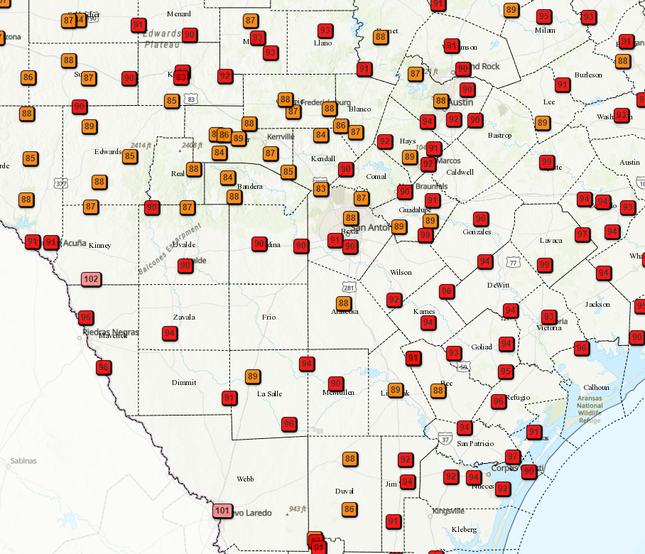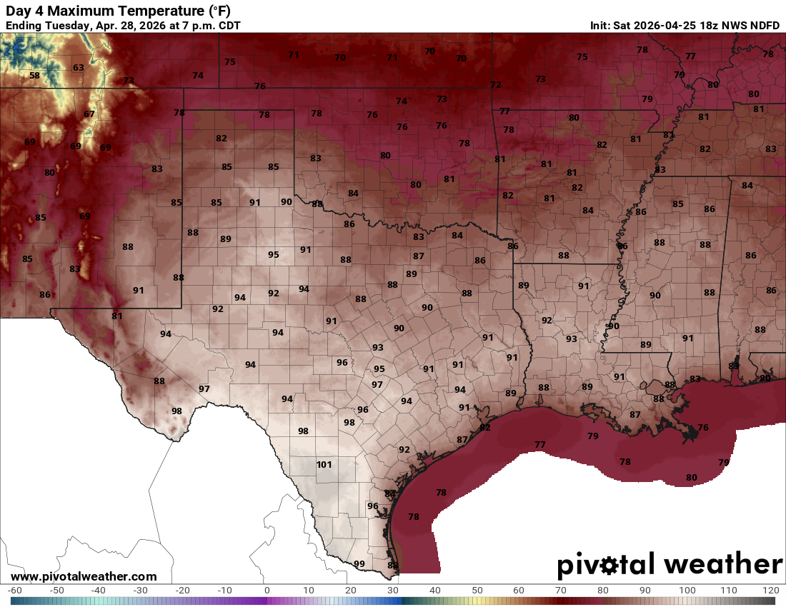 While there will continue to be a chance for isolated afternoon and evening severe storms through early next week, the odds are very low. Still, it never hurts to make sure you have your NOAA radio on standby and your emergency apps activated. The one part of the forecast that is a “for sure” deal is the heat and heat index, which will be on the rise through the middle of next week…details below. Fingers crossed that a front will move south by late Wednesday and Thursday, giving us another chance for rain. As of post time, the models are favoring south-central Texas on the rainfall totals, but a lot will depend on how for south the front goes before becoming stationary.