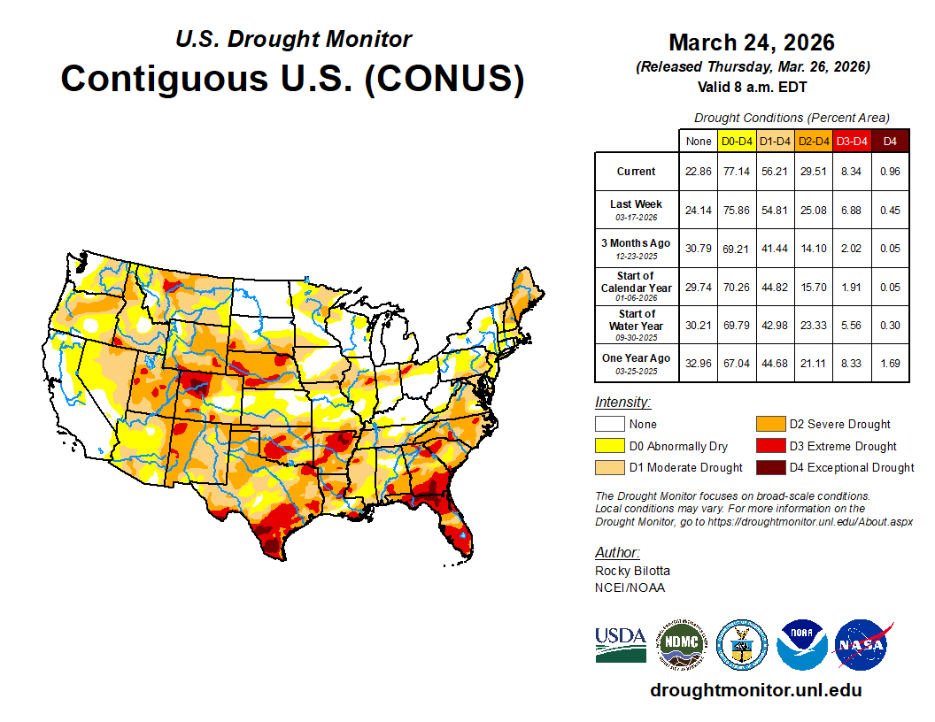 Live from Placitas, NM, where wild horses roam around the neighborhoods around here! Below is the latest drought update and as you can see, our conditions are going from bad to worse as we wind up the month of March. While the 7day forecast gives us no relief, models continue to forecast some rain by the end of the first week of April and the CPC forecasts are predicting a better than 50/50 chance for above normal precipitation.