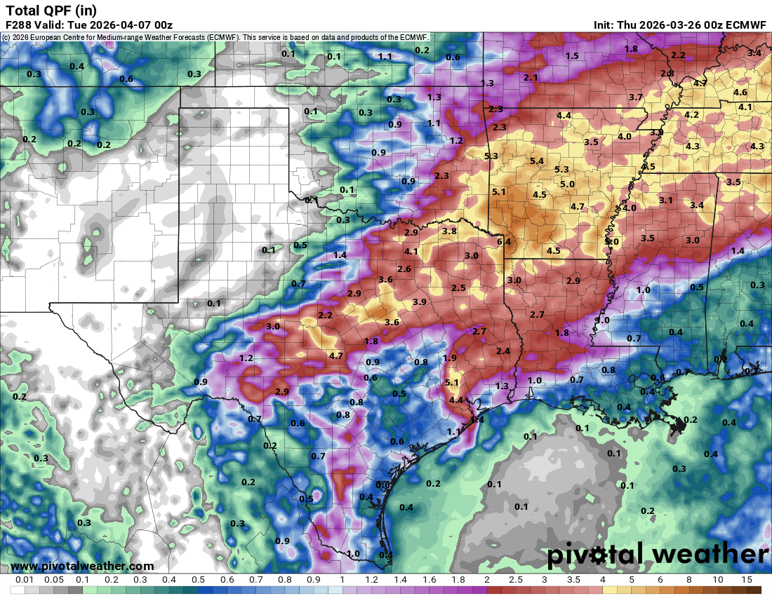 How much rain the latest Euro model thinks will fall during the first week of April.