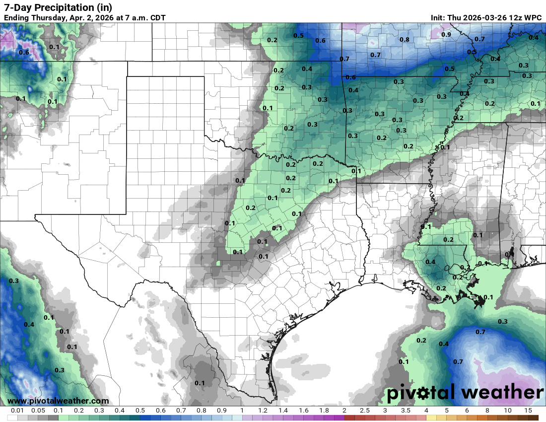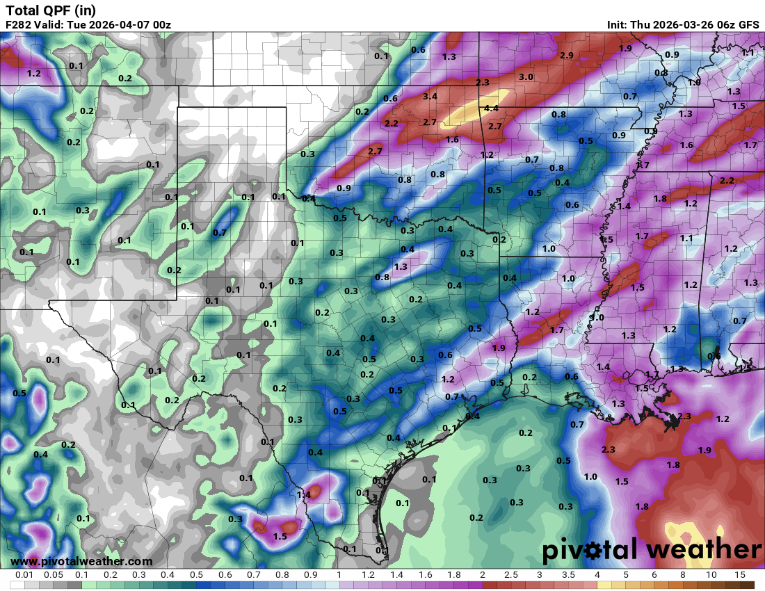 How much rain the latest GFS model thinks will fall during the first week of April.