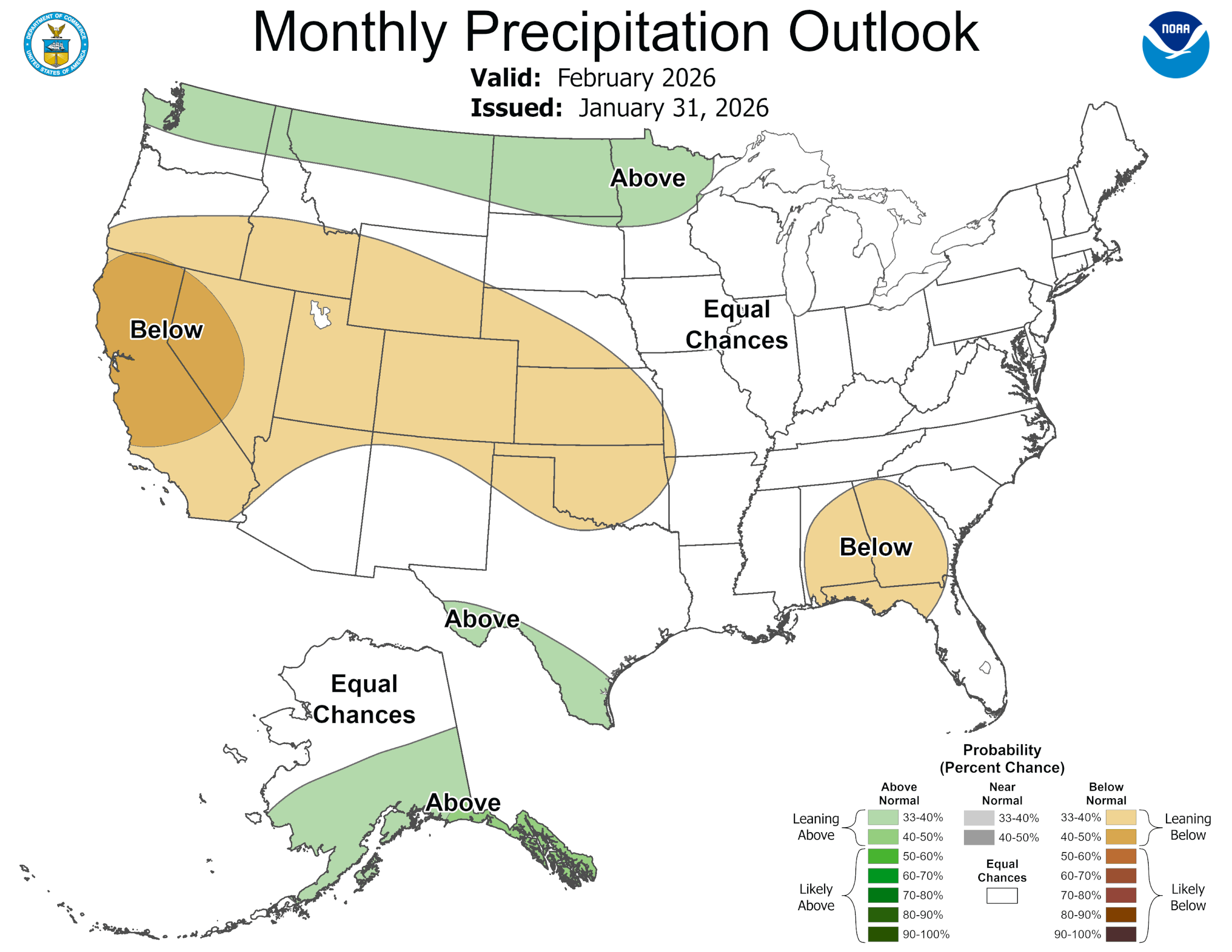 Rain odds continue to look bleak at least for another week! The latest CPC 8-14 day outlook continues to look promising but the only one of the models is forecasting any decent rain totals during that time frame. Speaking of the “Climate Prediction Center”, I have their latest guesses for February and seasonal forecasts for February-May below.