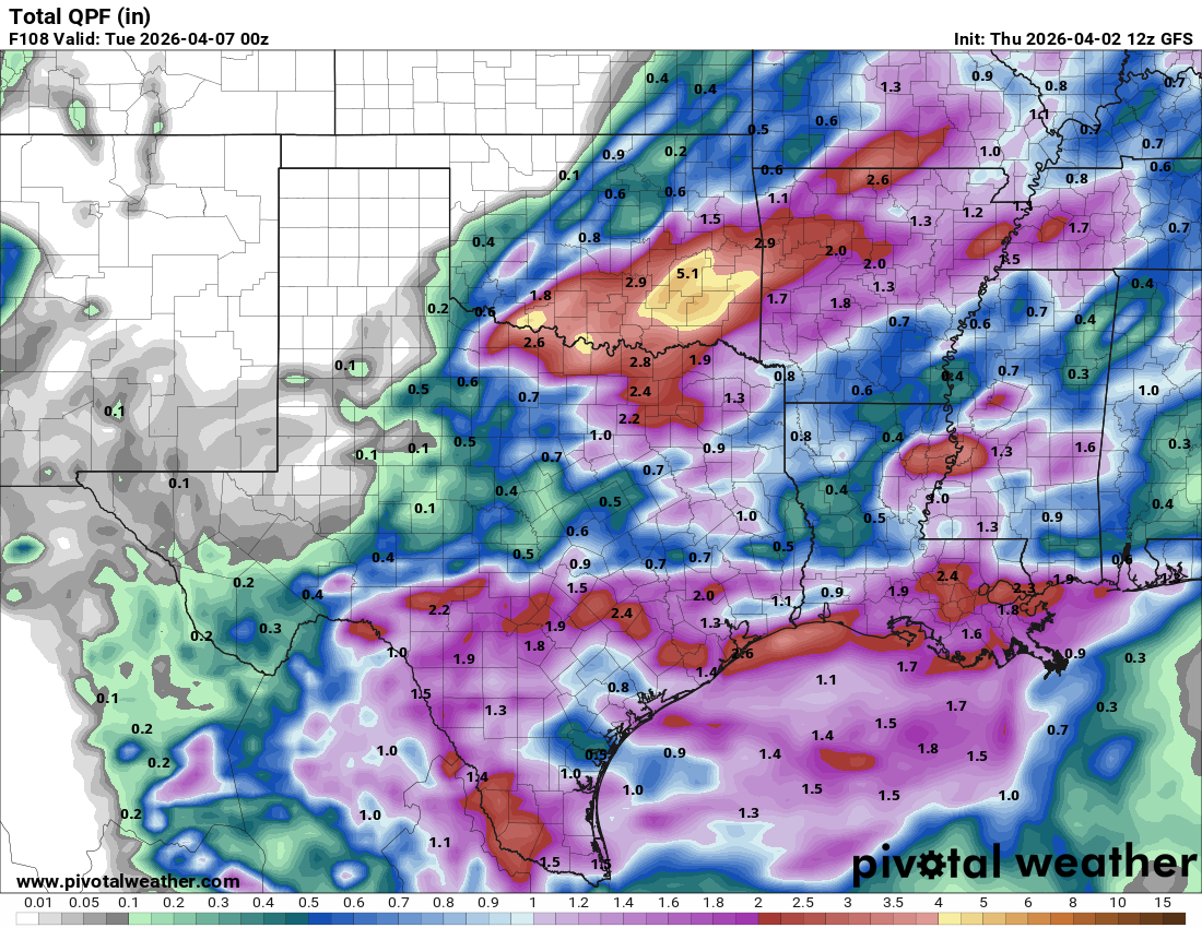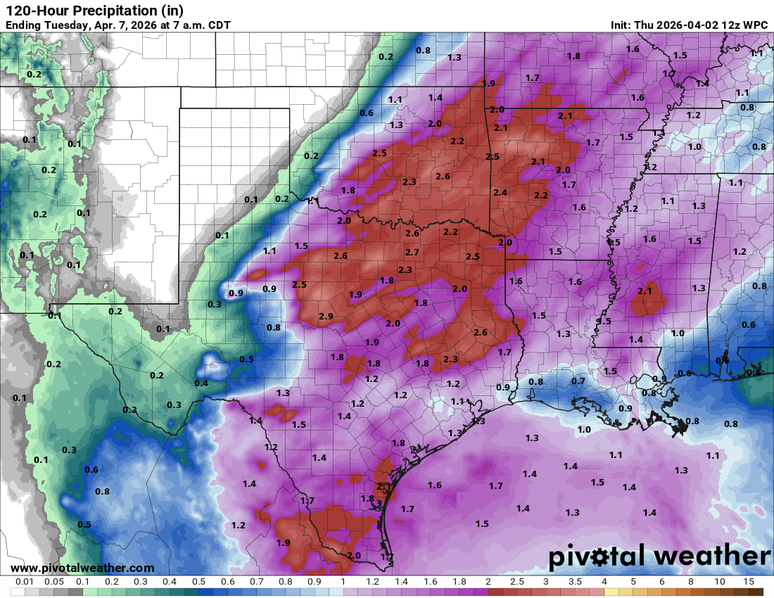 Round two will be very different than last night…from the NWS: “Confidence continues to grow with respect to the return of rain and cooler temperatures across South Texas this weekend. Models continue to be in good agreement with an upper trough bringing a moderate to strong cold front through the region sometime between Saturday and Sunday. With PWAT values increasing to 1.5-1.9" and favorable atmosphere dynamics, periods of moderate to heavy rain will be possible this weekend. There still is some uncertainty of exactly how much rain will fall. Current thinking is that we could see 1-2" areawide. Therefore, due to the potential of periods of heavy rain, the Weather Prediction Center has included all of South Texas in a marginal risk for excessive rainfall from Saturday morning through Sunday morning. Below normal temperatures will return to the forecast this weekend into early next week in the wake of this late season cold front.”