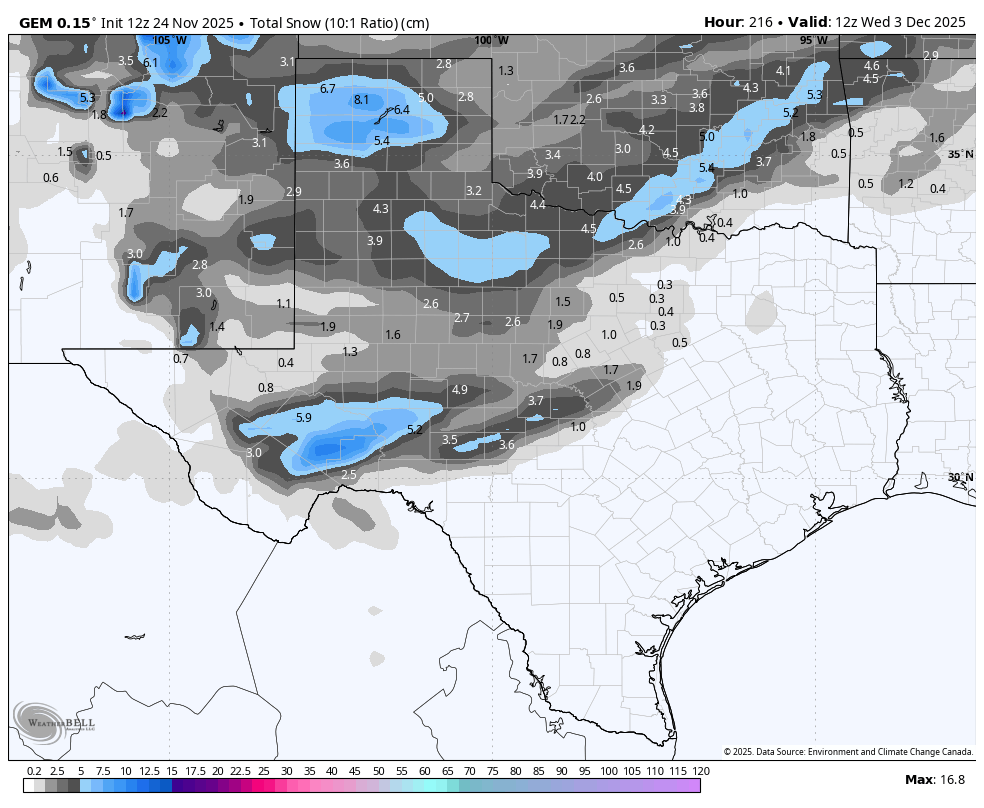 Well…the models are all over the place at the moment, but it does look likely that we will see some of the coldest air of the season arrive early next week. We may have highs not getting out of the 40’s and 50’s from Tuesday-Friday. If the Canadian model gets it right, snow could fall as far south as the Hill Country with lows in the 20’s. No need to raid your nearby HEB for toilet paper and distilled water yet, but it’s interesting to even see this as a possible scenario. I’ll keep you posted as always!
